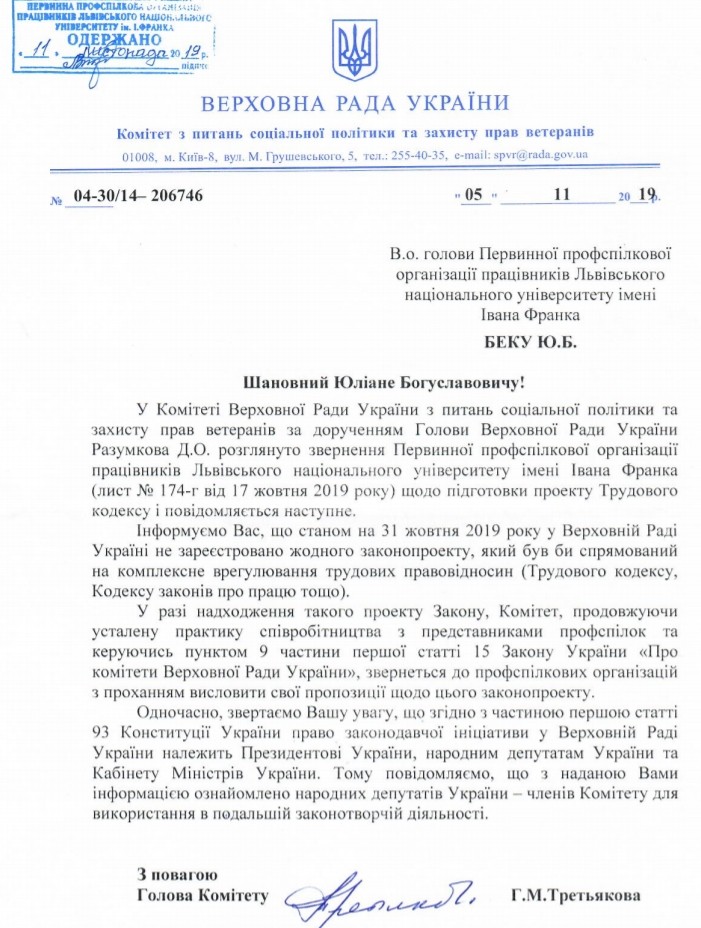 громадське 0ГЛЯД коментар фахiвця Відповідь на звернення профспілки Львівського національного університету імені Івана Франка =========================================================================================================== зу про звернення громадян Звернення трудового колективу національного природного парку “Сколівські Бескиди” до народного депутата України Лопушанського А.Я. Звернення трудового колективу КП «Кролевецьводоканал» до міського голови Олександра Бобровицького Звернення ректора до державної фінансової інспекції, щодо закупівель пального за завищенними цінами Звернення ГО “Національна Асамблея України” до ВРУ щодо опрацювання проекту Закону України “Про публiчнi консультацiї” поділитися з колегами ______________________________________________________________________ Про розгляд звернення профспілки Львівського національного університету імені Івана Франка Відповідь на звернення Центрального комітету профспілки працівників освіти і науки України щодо підвищення заробітної плати Відповідь на звернення професійної спілки працівників агропромислового комплексу України