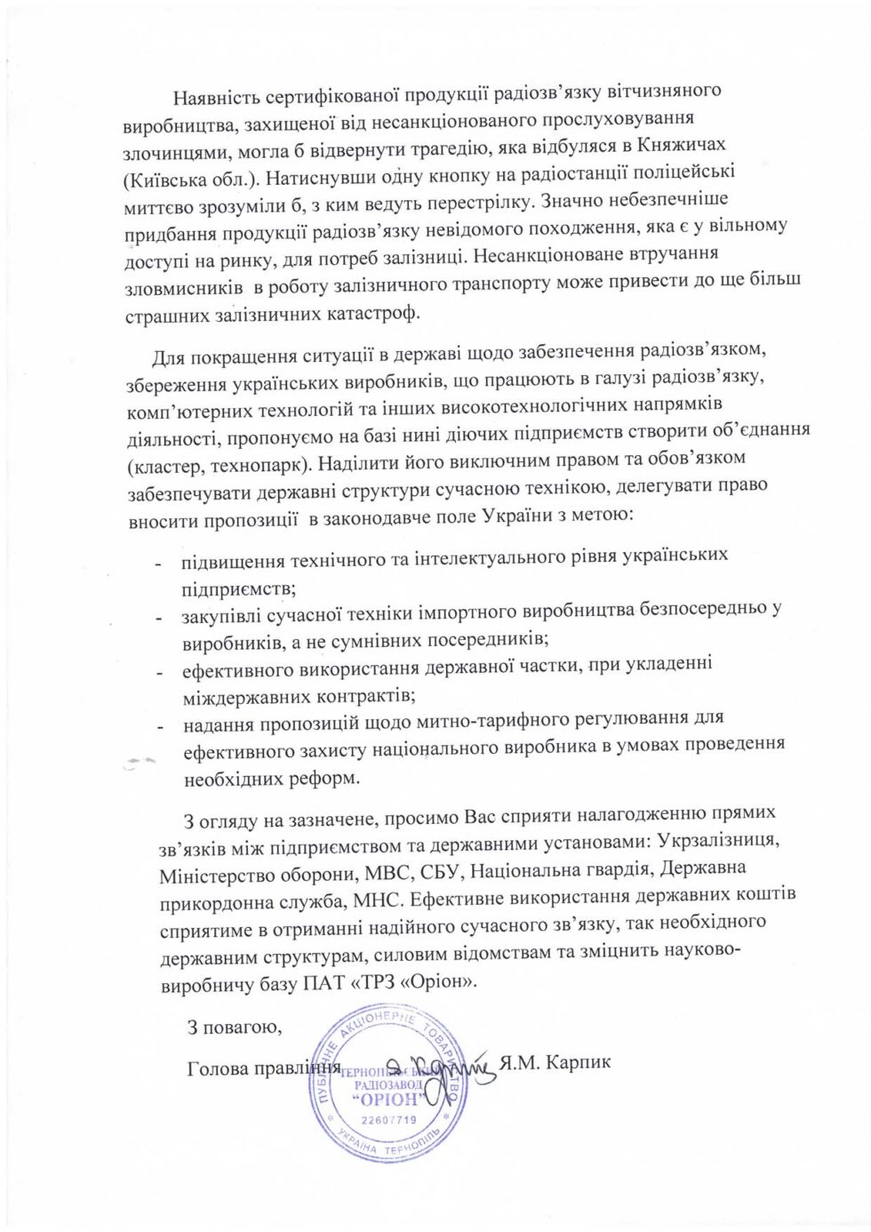 звернення голови правлiння пат “Тернопільський радіозавод “Оріон“ до Фонду державного майна України