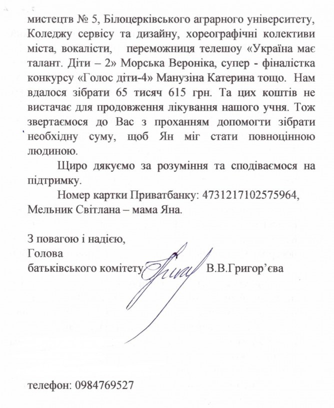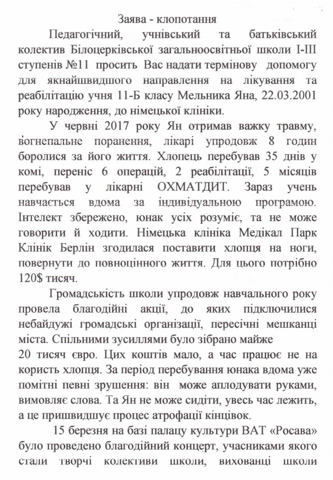 Звернення педагогічного, учнівського та батьківського колективів Білоцерківської загальноосвітньої школи №11 щодо надання допомоги на лікування Мельник Яна